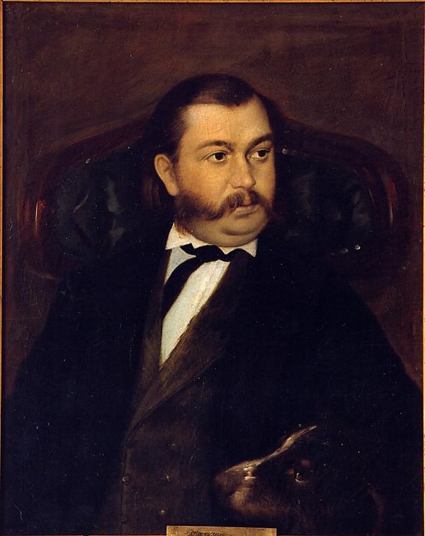 На картине изображён мужчина средних лет, сидящий в кресле. Его корпус обращён в фас, а лицо повернуто влево на три четверти, что подчёркивает особенности композиции портрета. Мужчина отличается бакенбардами, длинными усами и гладко зачесанными волосами. Он одет в чёрный расстёгнутый пиджак, под которым видны тёмная жилетка, белая рубашка и чёрный галстук. Справа на полотне изображена голова собаки. Фон выполнен в тёмных тонах, что акцентирует внимание на фигуре портретируемого.
