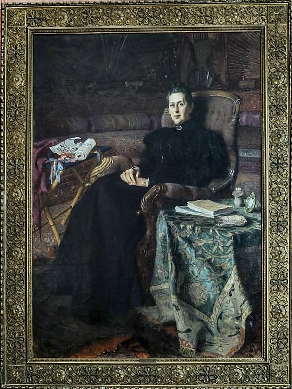 На картине представлен портрет женщины средних лет, сидящей в глубоком кресле с разворотом корпуса на три четверти вправо и лицом, обращённым к зрителю. Она одета в чёрное закрытое платье со стоячим воротничком, украшенным брошью, а на левой руке носит браслет. Тёмные волосы аккуратно зачёсаны назад с прямым пробором, руки сложены на коленях.