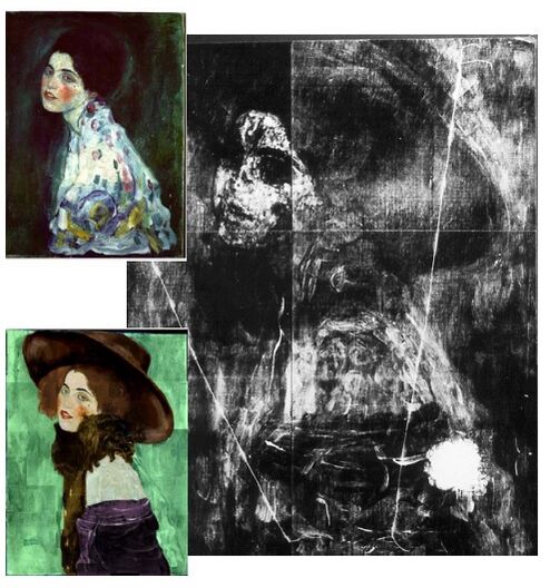 В 1996 году было сделано открытие: полотно оказалось единственной известной на сегодняшний день «двойной» (то есть впоследствии переписанной) работой Густава Климта[2][3][4][5]. 18-летняя студентка Клаудиа Мага (итал. Claudia Maga)[6], специализирующаяся по истории искусств, обратила внимание на схожесть поз женщин на картине «Портрет женщины» и на другой, считавшейся утраченной картине 1910 года. Она сделала фотокопии обеих работ, а затем с помощью кальки наложила друг на друга; силуэты женщин идеально совпали. Свою догадку Мага озвучила директору музея, который решил провести рентгеновское исследования картины. После изучения полученных снимков (см. иллюстрацию ниже), догадка студентки была подтверждена. Этому открытию была посвящена документальная программа телеканала BBC[7] и готовящаяся выставка, в преддверии которой полотно было похищено[4].