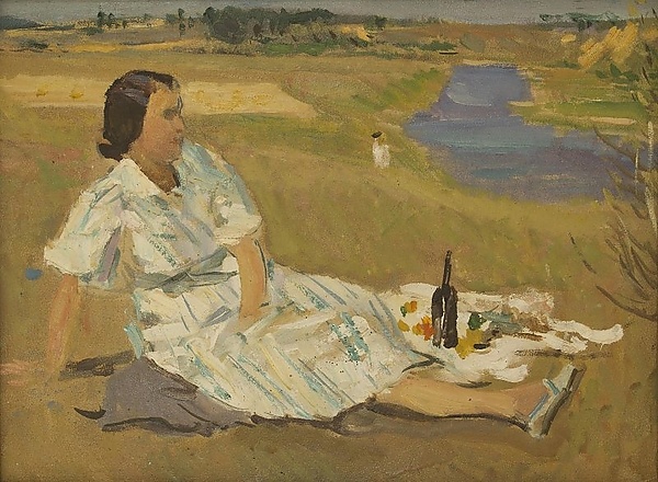 На переднем плане картины изображена женщина в светлом платье, сидящая на траве. Рядом с ней расстелена скатерть, на которой расположены продукты и бутылки, что создаёт сцену отдыха на природе, характерную для бытового жанра. На втором плане представлен равнинный пейзаж с рекой и лесом на горизонте. В работе преобладают белые, коричневые и голубые оттенки цветовой гаммы.
