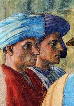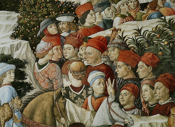 Беноццо Гоццоли со своими росписями в капелле волхвов (Палаццо Медичи-Риккарди, 1459—60), более консервативен, в нём больше готизирующих тенденций а-ля красочная интернациональная готика. Он воспроизводит новаторский теперь реализм в стиле и лицах, но при этом сохраняет декоративный эффект росписи и сказочную рыцарственность. Письма свидетельствуют, что художник беспрекословно слушался заказчика, Пьеро Медичи. Роспись покрывает все стены сплошным ковром, она задумана не как цикл фресок, а как единая декорация, непрерывно развёртывающаяся по стенам капеллы. Всего изображено около 150 фигур. Когда семья Медичи посещала капеллу, она видела на стенах знакомые лица и знакомые пейзажи. (Гращенков не соглашается с атрибуцией двух волхвов как константинопольского патриарха и византийского императора)[12] Он считает, что реальные портреты сосредоточены только в двух местах: группе всадников во главе с Пьеро Медичи и группе фигур в красных шапках на противоположной стене в «Шествии Старого волхва». Этим изображениям присущи композиционная и ритмическая неслаженность, разнобой по масштабу — что является результатом того, что эти головы повторяют отдельные портретные зарисовки, сделанные с натуры вне привязки к композиции фрески. Особенно хаотичны головы во второй группе — они обращены в разные стороны, втиснуты в пейзаж без всякой связи друг с другом и механически заполняют пространство по принципу «куда удалось вставить». В этой «мозаике» очевидна беспомощность Гоццоли в вопросе композиции, так как он отказался от ренессансного принципа перспективно-пространственного единства частей в целом и лишился возможности создать связную портретную группу. Каждая из изображённых им голов при этом, взятая по отдельности, демонстрирует его мастерство в натуралистичной передачи лица, его владение передачей головы в различных поворотах и ракурсах. Его же подтверждают сохранившиеся рисунки художника на окрашенной бумаги серебряным штифтом с белилами. Эти фрески — «запоздалый цветок рыцарской культуры», в который включены реалистические портреты, которые находятся в диссонансе с праздничной готикой стиля изображений.
