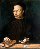 Та же тенденция к расширению и сюжетному усложнению композиции видна в других работах венецианцев. Увеличиваясь в размерах, портрет из лаконичной погрудной композиции превращается в целую картину. В портрете неизвестного художника из галереи Сабауда, Турин — уже целая полуфигура с руками, на парапете книга и цветок, рука поднята в жесте — открытой ладонью вверх (что обозначает вопрос).