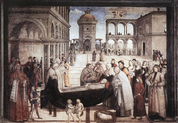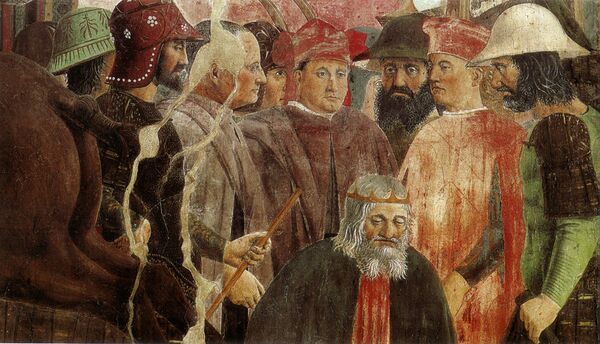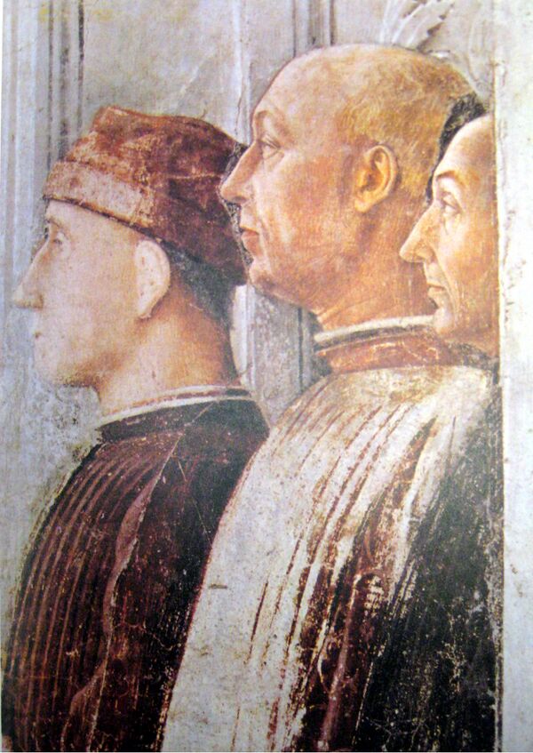 Во всех рассмотренных произведениях монументальной церковной живописи складывается новый тип ренессансной «исторической» композиции[14]. Легенда и реальность соседствует в них, но не сливается. Иногда два мира существуют параллельно, объединённые лишь общей иносказательной идеей, политической или морально-дидактической. Иногда художник показывает причастность реальных людей к свершающемуся чуду, не растворяя их образы в легенде. Подчас модели играют роль как актёры; иногда остаются лишь зрителями, безучастными внешне, но проникнутые сознанием важности происходящего. Хотя сегодня там такое смешение кажется механическим и разрушающим единство, но для современников это было своего рода литургическим шествием; зрители, созерцая фреску, представляли себя не зрителем, а соучастником, будто бы праздничного представления (миракли, мистерии, священные представления, живые картины). Алпатов сказал, что торжественные портретные фигуры во фресках составляли «нечто вроде хора в античной трагедии». Во фресках возникает новый theatrum — с архитектурными декорациями и размещением фигур на авансцене. Прихожанам в церкви изображённые на стенах служили примером, следует учитывать и психологический эффект узнавания.