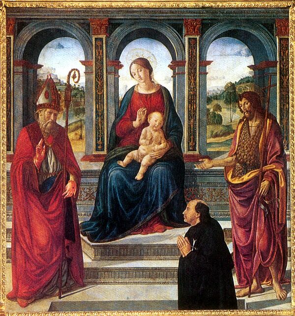 Другой художник, Перуджино, однажды нарушил традицию связывать образы донаторов со святыми композиционно: он создал портреты двух монахов (маслом) из обители Валломброзе близ Флоренции по имени Бьяджо Миланези, генерал ордена и Бальдассаре ди Антонио ди Анджело, управитель монастыря (ок. 1499, Уфицци). Это изображения голов, поднятых, с устремлёнными вверх взглядами — возможно, что эти изображения находились в пределле под алтарным образом «Вознесения Марии с четырьмя святыми» (1500, Уффици). То есть, эти портреты, визуально в настоящий момент воспринимающиеся как станковые, на самом деле функционально были тесно связаны с монументальной религиозной композицией. Также, с сильно поднятой головой, Перуджино нарисовал Сикста IV в несохранившемся алтарном образе Сикстинской капеллы на тот же богородичный сюжет (известен по рисунку круга Пинтуриккьо, Вена, Альбертина).