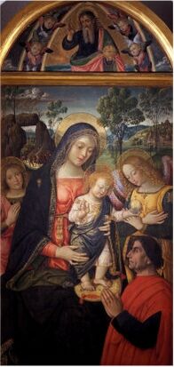 Другое решение вотивной композиции — донатор изображён не рядом со святым, а видит его издалека, как небесное видение. Впервые решение употреблено в картине Франческо Боттичини, «Успение Марии», (1474—1475, Лондон, Национальная галерея) с изображениями Маттео Пальмиери и его жены (лица сильно пострадали)[5]. Затем Перуджино написал на стене Сикстинской капеллы большой алтарный образ (1481; позднее уничтожен при работе Микеланджело), где изобразил Вознесение Марии с коленопреклонённым Сикстом IV. Два донаторских портрета в Апартаментах Борджа (Ватикан, 1492—94) созданы Пинтуриккьо и мастерской: Зал Таинств, простенок с люнетом, «Воскресение Христа» с папой Александром VI. Три пробудившихся стражника — возможно сыновья папы. Ещё одна фреска того же зала — «Вознесение Марии»: помощник художника, Антонио да Витербо написал донатора, возможно — Франческо Борджа, кузена и казначея папы. (В «Диспуте св. Екатерины Сиенской» там же в образе святой, как считается, изображена Лукреция Борджиа).