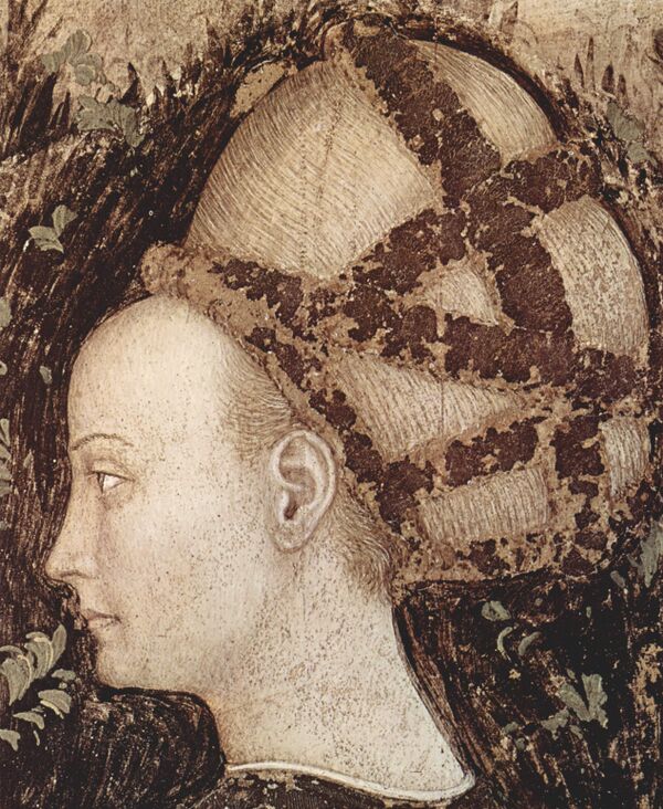 Палаццо Скифанойя было украшено в 1469—71 гг. феррарскими мастерами. Известно два имени — Франческо дель Косса и Бальдассаре д’Эсте, хотя, судя по стилистическому анализу, их было не меньше пяти. Фресками украшен большой зал парадного этажа, это сложный аллегорико-астрологический ансамбль на сюжет 12 месяцев. Ансамбль сохранился наполовину и сильно повреждён. Во фресках нижнего уровня показаны бытовые сцены из жизни герцогского двора. Реализм этих фресок ещё ограничен, в нём много готических пережитков[17]. Наиболее интересны портретные изображения во фресках, написанных Коссой («Март» и «Апрель»). В каждой фреске представлен герцог и его приближенные в двух самостоятельных жанровых сценах — беседа под сводами портика и кавалькада на открытом воздухе. В первом случае фигуры стоят свободно, образуя почтительный кружок вокруг государя, их лица показаны в различных поворотах и даны тоньше. Всадники изображены более архаично и плоскостно, головы почти всегда в профиль и повернуты в одном направлении. В обоих типах композиции выдержан главный принцип придворного группового портрета — выделение образа монарха, без назойливости, но отчетливо. Фигуры поставлены так, что герцог виден сразу — он выделяется своей осанкой, костюмом, но больше всего — подчёркнутой индивидуализацией лица, мимики, жестов. Это самая выразительная фигура на фреске, самая естественная и активная. Чем дальше от него расположены придворные, тем их образ нивелированнее и однообразней.