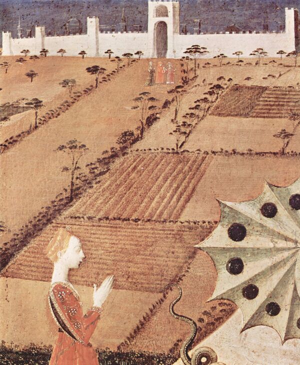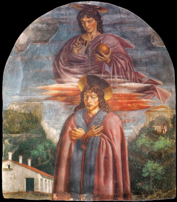 Попробовать себе представить, каковы были портреты в этих фресках, можно по другим произведениям этих художников. Например, Андреа дель Кастаньо написал «Мадонну Пацци» (капелла замка Треббиа, после 1455, сейчас Палаццо Питти, Флоренция) и включил в типичную композицию фигурки двух детей Ренато и Оретты, сына и дочери заказчика Пьеро ди Андреа деи Пацци. Дети держат подарки для Мадонны, они обращены к зрителю, отвлекаясь от религиозного действия. Вероятно, это самые ранние портреты детей в живописи кватроченто[11]. Интересно вспомнить образ святого Юлиана его же работы (ц. Сантиссима Аннунциата, Флоренция, 1454), на фоне пейзажа его родного городка Кастаньо, которая может быть идеализированным автопортретом (согласно источникам, там же в несохранившейся фреске он написал свою жену в образе Марии Магдалины).