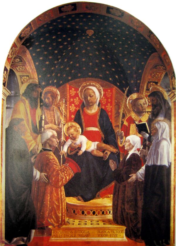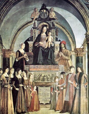 Ту же тему, но решённую оригинальнее, демонстрирует алтарная картина Мантеньи «Мадонна делла Виттория», заказанная маркизом Франческо II Гонзага в память победы в битве при Форново. Программа задумывалась как Мадонна делла Мизерикордия, которая покрывала бы плащом маркиза и его братьев, а с другой стороны — его супругу Изабеллу д’Эсте, но эта идея не была осуществлена, и Богородица покрывает плащом лишь одного Франческо. Архитектурного окружения нет — присутствует зелёная беседка.