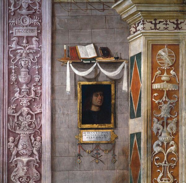 Перуджино в 1497—1500 распишет приемный зал Колледжо дель Камбио (Перуджа) евангельскими сюжетами, аллегориями и гротескными орнаментами. На орнаментированной пилястре он напишет автопортрет, имитируя станковую картину, повешенную на цепочку. Под ней напишет латинскую надпись: «Петр — превосходный перуджинский живописец. Что утеряло искусство, вновь возродил он, живописуя. То, чего не было в нём, заново он изобрел. Год 1500». Пинтуриккьо повторит этот эксперимент (1500—1501, капелла Троило Бальони, ц. Санта Мария Маджоре, г. Спелло) во фреске «Благовещение», где его «портрет» будет «висеть» на стене и будет окружен иллюзорными обманками.