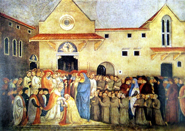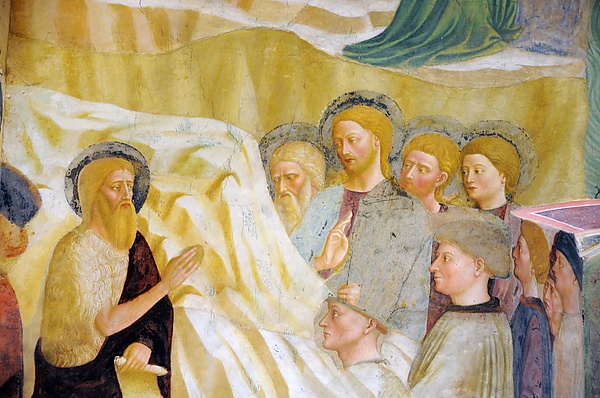 Новаторская роль в этом вопросе опять принадлежала Мазаччо, который в церкви Санта Мария дель Кармине (Флоренция) написал фреску на сюжет торжественного освящения этого храма архиепископом Америго Корсини, имевшем место в апреле 1422 года. Не сохранившаяся до наших дней фреска находилась в монастырском дворе на стене над входом, была выполнена монохромно («зелёной землей»). Вазари сообщает о бесчисленном количестве изображённых там именитых граждан города, следовавших за процессией. Композиция реконструируется по его описанию и по ряду рисунков (в том числе молодого Микеланджело). Скорее всего, она походила на мазаччевское «Чудо со статиром» и «Воскрешение сына Теофила» (Капелла Бранкаччи). В центре, видимо, изображался сам акт посвящения церкви, а по обе стороны — симметрично стоящие фигуры граждан, которые располагались рядами, уходящими в глубину. Может быть, под влиянием этой фрески Гирландайо написал «Воскрешение сына нотариуса» (1482—85, церковь Санта Тринита), а Биччи ди Лоренцо — «Освящение госпитальной церкви Сант Эджидио папой Мартином V в сентябре 1420 года» (1420—21, Санта Мария Нуова), впрочем, по датам выходит, что Биччи ди Лоренцо мог написать свою работу раньше Мазаччо. Мазаччо, в отличие от него, представил сцену освящения не как церковный акт, а как торжественное событие из гражданской жизни Флоренции, перенеся акцент на портреты выдающихся современников.