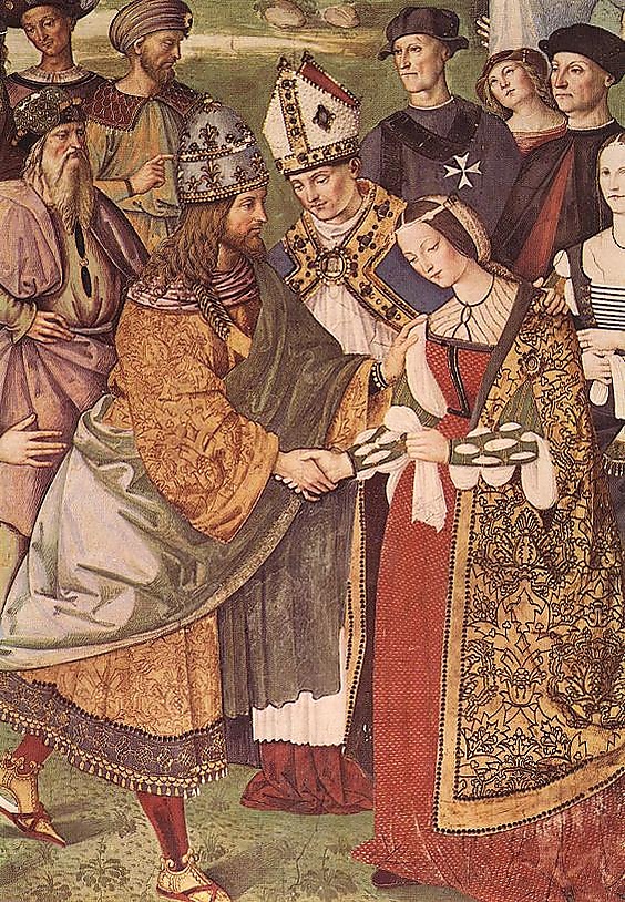 В его же фресках в упоминавшихся выше Апартаментах Борджиа сохраняется очарование умбрийских пейзажей, но композиция более архаична, нарушена перспектива и применены рельефные орнаменты с позолотой. Одна из фресок — «Диспут св. Екатерины Сиенской» согласно легенде содержит портрет Лукреции Борджиа, изображённой в виде святой. В её левой части — ряд портретных лиц, например, считалось, что автопортрет — второй с края. В двух фигурах по краям императора усматривали двух знатных беглецов, живших в Ватикане — Андрея Палеолога, деспота Мореи (слева) и принца Джема, сына Мехмеда II.