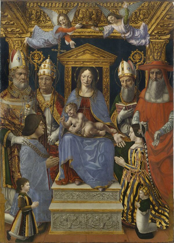 Витторе Карпаччо оригинально решил эту задачу, по своему перетолковав композицию традиционного «Поклонения младенцу» (1505, фонд Гульбенкяна): донаторы поклоняются Христу в одной эмоциональной плоскости со Святым Семейством, заменив евангельских пастухов. Донаторы становятся уже не зрителями, а соучастниками события.