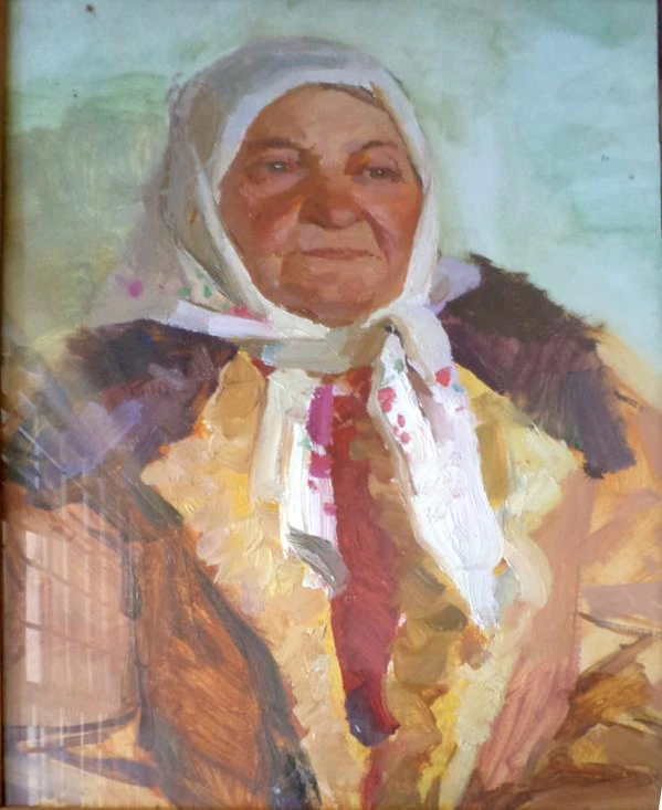 На картине представлено поясное изображение пожилой женщины в полушубке. На голове у неё белый платок. Фон выполнен в нейтральных тонах, что подчёркивает внимание к изображаемому персонажу и соответствует традициям портретного жанра.