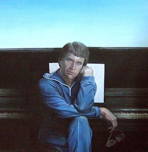 На полотне представлен молодой мужчина в светло-синем спортивном костюме, держащий очки в правой руке и опирающийся на согнутую левую руку. Он сидит нога на ногу у чёрного рояля, на котором лежит белый помятый нотный лист, подчёркивающий связь с музыкой. Фон выполнен в голубоватых тонах, что формирует характерную цветовую гамму композиции.