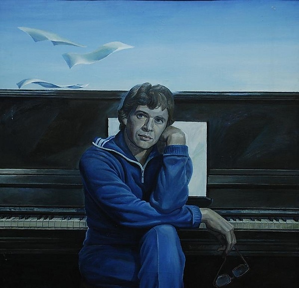 На картине изображён молодой мужчина в спортивном голубом костюме, сидящий в расслабленной позе с мечтательным выражением лица. Его левая рука поддерживает голову, опираясь на правую, лежащую на колене, а крупные правильные черты и волнистые волосы подчёркивают индивидуальность портретируемого. На заднем плане размещено фортепиано, на пюпитре которого лежит белый лист бумаги, а над инструментом на фоне голубого неба парят три листка, что может ассоциироваться с творческим процессом композитора. Справа на крестовине присутствует авторская надпись с указанием имени портретируемого, датой и техникой (акриловая живопись), а внизу справа — подпись художника.