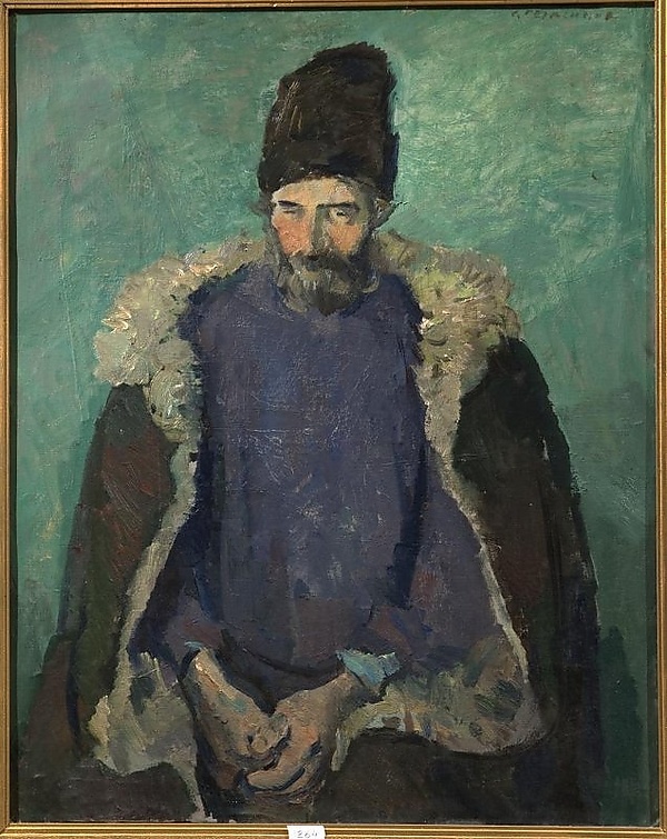 На картине представлен пожилой крестьянин, изображённый выше колен в сидячем положении со сложенными руками. Его внешность подчёркнута тёмными усами и бородой, а на голове видна высокая чёрная шапка. Поверх лиловой рубахи на плечи накинут тёмный тулуп с белым воротником. Фон выполнен в светло-зелёных оттенках, что придаёт работе особую цветовую гамму. Картина относится к жанру портрета.