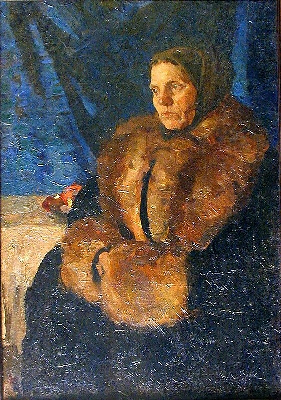 На картине изображена сидящая пожилая женщина в положении 3/4 влево, показанная ниже колен. Она одета в коричневый платок и чёрное пальто с коричневым меховым воротником и манжетами. Слева на столе, покрытом скатертью, расположено блюдо с овощами, что добавляет жанровую деталь к композиции. Фоном служат синие драпировки, создающие выразительный колорит портрета.