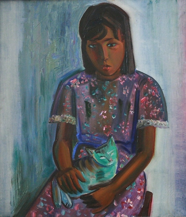 На полотне представлен поколенный портрет девочки среднешкольного возраста с чёрными волосами, спускающимися за спину, и смуглой кожей. Лицо изображено в фас, а ноги слегка повёрнуты вправо. Девочка сидит на тёмно-красной табуретке, опустив руки и придерживая кошку. Она одета в фиолетовое платье в цветочек с короткими рукавами. Фон выполнен в зелёно-синих тонах с переходами к светло-голубым и розовым оттенкам, что придаёт работе выразительную цветовую гамму.