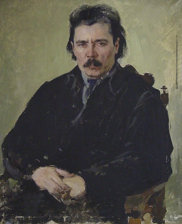 На полотне представлено поколенное изображение сидящего мужчины на фоне светлой стены. Фигура развёрнута влево в 3/4, при этом голова обращена в фас, что подчёркивает выразительность портретного образа. Серьёзное выражение лица, слегка нахмуренные брови и усы над верхней губой придают модели собранный и сосредоточенный вид. Мужчина одет в чёрную куртку, в отворотах воротника которой видны рубашка и галстук, что подчёркивает строгость костюма.