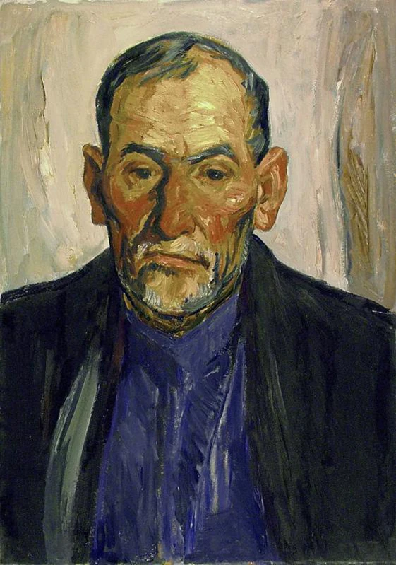 На картине представлен погрудный портрет пожилого мужчины, изображённого анфас. Его внешность характеризуют короткая борода и усы. Мужчина одет в чёрный пиджак и синюю рубашку. Фон работы выполнен в серых тонах, что подчёркивает сдержанность композиции.