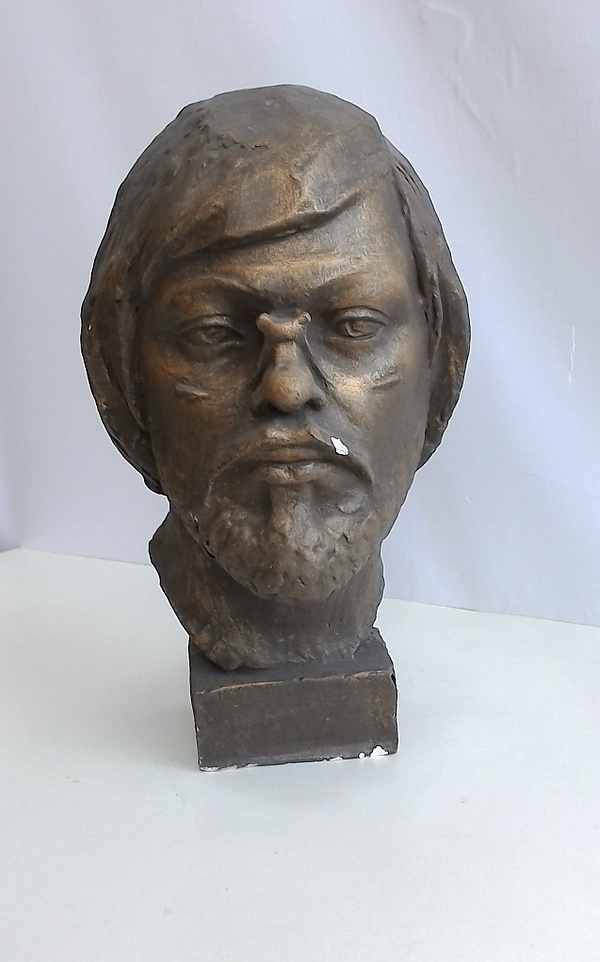 Изображён бюст, представляющий голову мужчины, установленную на небольшом прямоугольном основании. Лицо выполнено в фас. На переносице частично вылеплены очки (мост и нижние половины ободков). Взгляд направлен прямо, немного вниз. Волосы длинные, закрывающие уши; чёлка направлена вправо. На лице присутствуют классическая борода и усы.