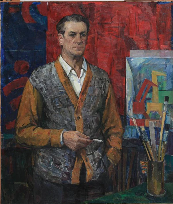 На картине представлен поколенный портрет мужчины, изображённого в фас. Герой одет в пуловер поверх белой рубашки, его волосы зачесаны назад, на бороде заметна ямочка. Левая рука мужчины опущена в карман, в правой он держит папиросу. На переднем плане размещён фрагмент стола, покрытого зелёной тканью, на котором стоит ваза с кистями. Фон работы выполнен в сине-красной цветовой гамме: на красном участке видны фигуры солдат, справа изображены листы с рисунками кранов и строительных объектов.