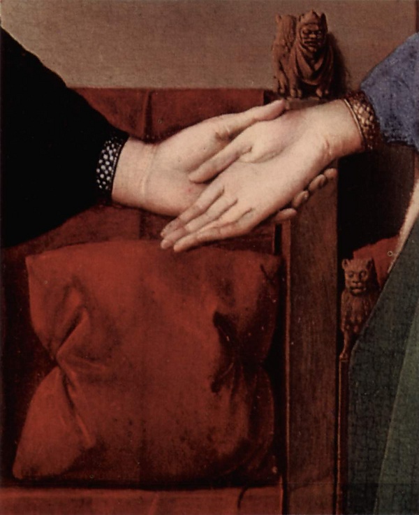 Как утверждает Панофский, весь обряд состоял в том, что вступающие в брак произносили слова обета, при этом жених клятвенно поднимал вверх руку, залогом верности служило кольцо. Кульминация церемонии наступала во время соединения рук жениха и невесты. Все детали указывают на то, что на портрете изображён именно такой обряд, а сама картина, вероятно, выступала в роли живописного свидетельства бракосочетания[41].