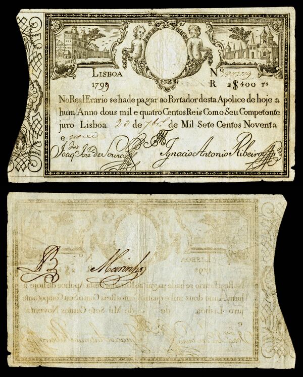Первые португальские бумажные деньги были выпущены правительством в 1797 году. Вплоть до 1807 года выпускались банкноты номиналом в 1200, 2400, 5000, 6400, 10,000, 12,000 и 20,000 реалов. Некоторые из них были в обращении вплоть до Мигелистских войн.