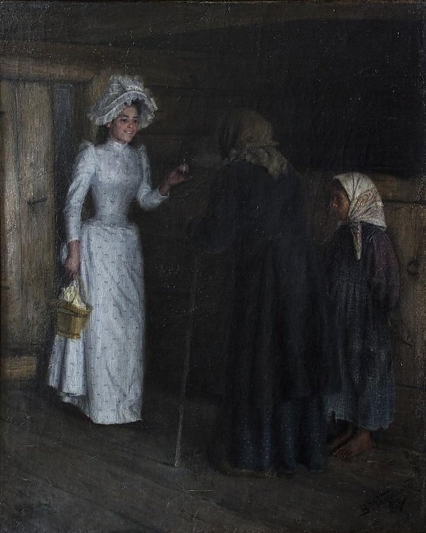 На полотне представлен интерьер жилого помещения. У входа в комнату находится женщина в светлом платье, рядом с ней — старуха, изображённая спиной к зрителю, и босоногая девочка. Композиция построена на сопоставлении фигур разного возраста и их размещении в пространстве комнаты, что характерно для бытовой живописи.