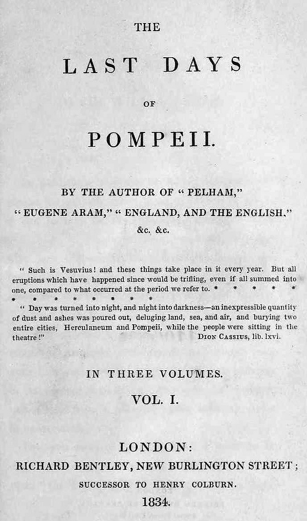 - The last days of Pompeii : In Three Volumes / by the Author of «Pelham»… etc. — L. : Richard Bentley, 1834. — Vol. I. — xvi, 315 p. — Dedication to Sir William Gell.