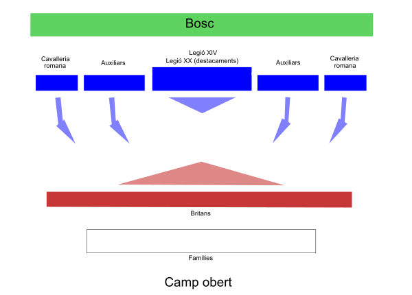 Однако римляне, более умелые в открытых сражениях, противопоставили числу навыки. В начале сражения римляне обрушили на бриттов, рвавшихся к их рядам, тысячи дротиков. Те римские солдаты, которые избавились уже от дротиков, плотными фалангами разбивали вторую волну бриттского наступления. После этого фаланги были построены клиньями, которые с фронта ударили по бриттам. Не выдержав натиска, бритты побежали, однако путь к отступлению был закрыт обозом с их семьями. Там, у обозов, римляне настигли противника и устроили беспощадную резню[1].
