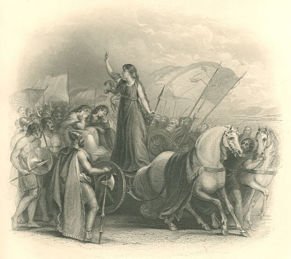 Тацит пишет, что Боудикка управляла своими войсками с колесницы, обратившись перед битвой к своим людям с речью, в которой просила считать себя не царицей, которая мстит за потерянное царство, а обычной женщиной, мстящей за своё избитое плетьми тело, за поруганное целомудрие дочерей. С её слов, боги были на их стороне, один легион, решившийся противостоять им, они уже разбили, разобьют и другие.