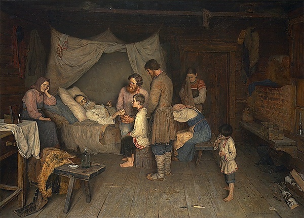 Композиция построена вокруг сцены прощания с умирающим стариком, лежащим на кровати под откинутым пологом в глубине интерьера избы. У его изголовья сидит пожилая женщина, опирающаяся рукой на подушку. Вокруг кровати собрались близкие: рыжеволосый мужчина, мальчик-подросток, стоящий мужчина, а также две молодые женщины, выражающие скорбь — одна плачет, стоя и вытирая слёзы фартуком, другая сидит на лавке с опущенной головой. На переднем плане справа изображён маленький босоногий мальчик, а слева — деревянная лавка с тулупом, бутылём, блюдцем и закрытой книгой. У левого края холста видна часть стола с белой тканью, на котором размещены икона и оплавленная свеча. Многочисленные детали быта подчеркивают принадлежность сцены к бытовому жанру и усиливают реалистичность композиции.