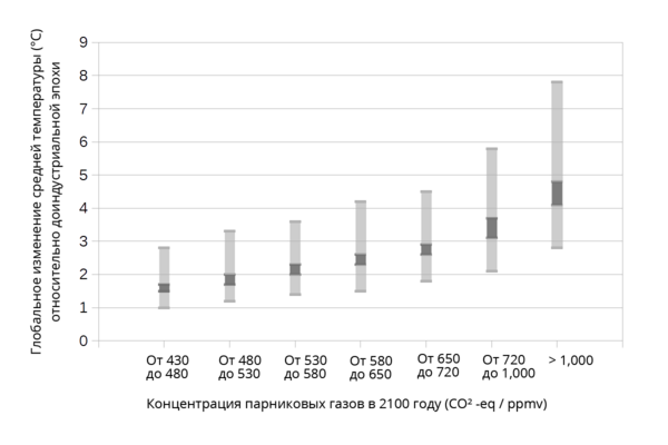 В краткосрочной перспективе политика в отношении климатических изменений может оказать положительный долгосрочный эффект[4][6]. Строгая политика по смягчению последствий изменения климата может ограничить глобальное потепление к 2100 году примерно до 2 °C, или ниже. Увеличение мирового потребления энергии, и расширение добычи ископаемого топлива[7], может привести к глобальному потеплению примерно на 4 °C[8][9]. Более высокие увеличения температур значительно затруднят адаптацию[10], и повысят риски негативных последствий[11].