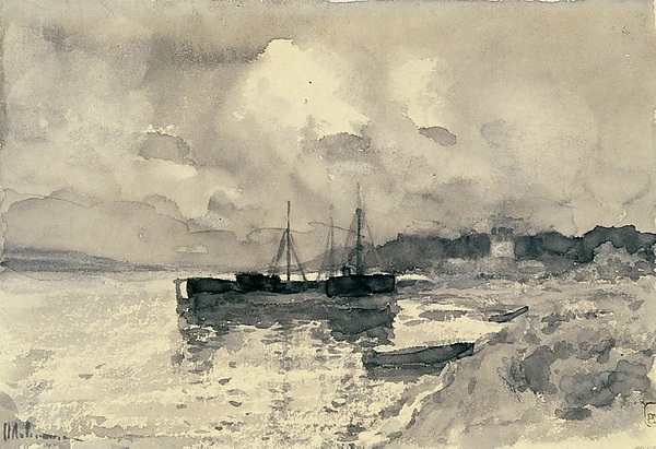 Известны два акварельных этюда, написанные Левитаном при работе над полотном[1][29][30]. Один из них — «На реке» (бумага, акварель, 15,2 × 22,4 см) — находится в собрании Государственного Русского музея (инв. Р-6084). Этот этюд, ранее находившийся в собрании С. С. Боткина, был написан Левитаном осенью 1889 года. Другой этюд — «После дождя. Плёс» (бумага, акварель, чёрный карандаш, 16,5 × 26,5 см), также 1889 года, — хранится в частном собрании в Москве (по данным на 1966 год — в собрании Ю. В. Невзорова)[31]. Искусствовед Алексей Фёдоров-Давыдов писал, что эти этюды показывают, насколько интересовала художника «передача изменчивости летнего ненастного дня». По его словам, не очень отличаясь друг от друга по композиции, эти натурные этюды главным образом различаются изображением водной поверхности и облачного неба: «…в акварели „После дождя“ состояние более спокойное, в акварели „На реке“ усиливаются движение облаков и в особенности рябь на воде и колеблющиеся отражения в ней тёмных барж». Поэтому, по мнению Фёдорова-Давыдова, этюд «На реке» более близок к окончательной версии полотна[32][33]. Оба акварельных этюда монохромны — они «исполнены лиловатой краской с использованием белого цвета бумаги для высветленных мест»[34].