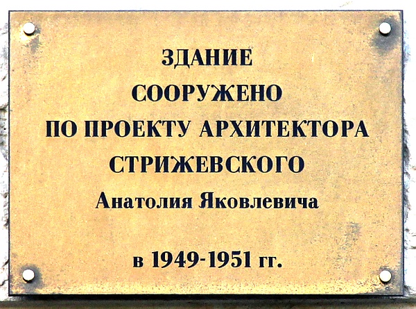 Строительство здания началось в 1949 году по проекту советского архитектора Анатолия Яковлевича Стрижевского. Декоративно-монументальную скульптуру создал художник В. Н. Масютин. В проектировании интерьеров принимал участие инженер-майор Г. И. Лебединский. Инженеры — А. П. Сирин, В. А. Бушковский и Н. Ф. Воробьев.[4][5]