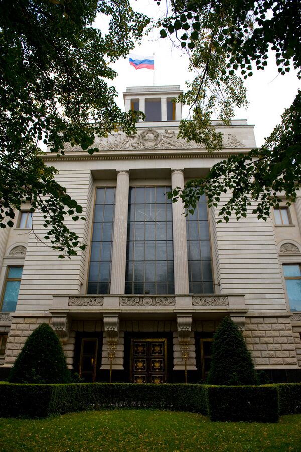Первое посольское здание на месте нынешнего посольства было построено уже в 1837 году. В те времена Российская империя для постоянной дипломатической миссии в Пруссии приобрела в Берлине двухэтажное здание в стиле рококо с участком земли между улицами Унтер-ден-Линден и Беренштрассе. Двухэтажный особняк был возведён в 1734 году и с 1764 года находился в собственности принцессы Амалии Прусской. В соответствии с принятым в ноябре 1808 года городским постановлением русский император, как владелец участка городской земли, получил право стать гражданином города Берлина. Городская управа удостоила императора звания почётного гражданина. 18 октября 1837 года, после того как были улажены все формальности, в присутствии около 30 тысяч берлинцев Николай I получил свидетельство о звании почётного гражданина города[1].