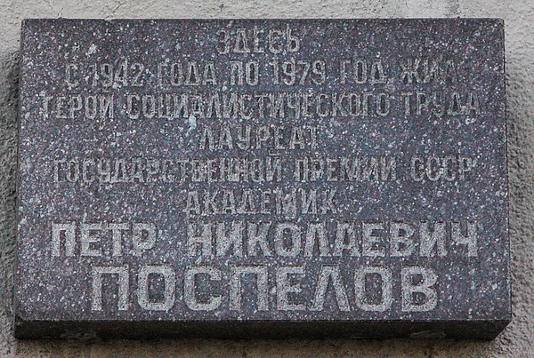 Пётр Никола́евич Поспе́лов (8 [20] июня 1898, пос. Кузнецово — 22 апреля 1979, Москва) — советский партийный деятель. Секретарь ЦК КПСС (1953—1960). Кандидат в члены Президиума ЦК КПСС (1957—1961). Член Бюро ЦК КПСС по РСФСР (1960—1961). Герой Социалистического Труда (1958). Лауреат Сталинской премии первой степени (1943). Член КПСС с 1916 года. Академик АН СССР (23 октября 1953, член-корреспондент 4 декабря 1946).