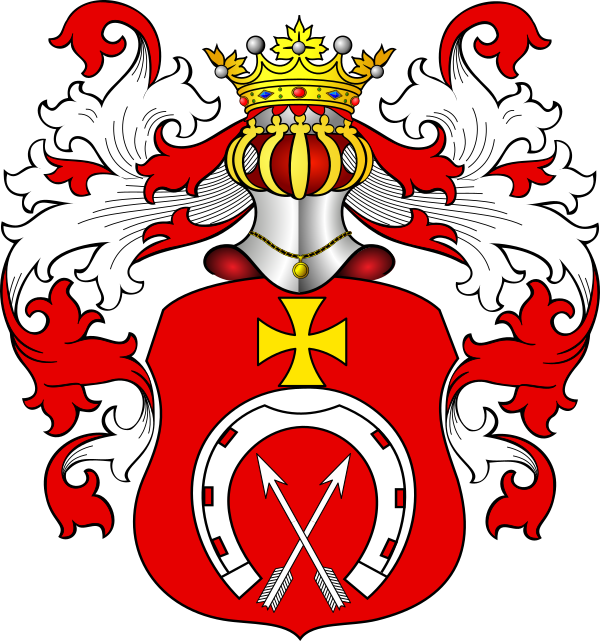 В красном поле опрокинутая подкова, увенчанная кавалерским крестом и сопровождаемая внутри двумя стрелами в андреевский крест.