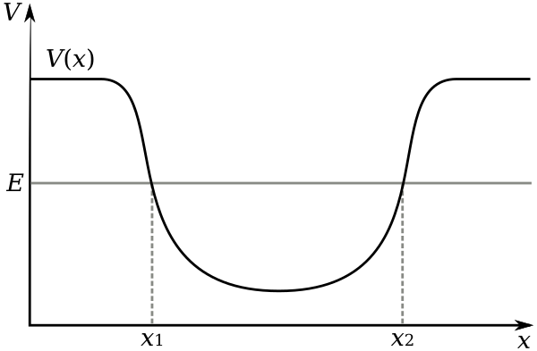 В одномерном случае, когда потенциальная энергия зависит только от одной декартовой координаты , можно выделить энергию движения частицы в направлении этой координаты и энергию движения в перпендикулярной плоскости (). Движение в плоскости происходит с постоянной скоростью. Движение вдоль оси ограничено точками , , в которых . Если никакого движения в плоскости нет, то (см. рис.).