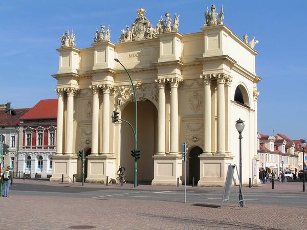 Бранденбургские ворота Потсдама в своей нынешней форме были построены в 1770 году по приказу Фридриха II. По окончании Семилетней войны старые ворота на этом месте были снесены и заменены новым монументальным сооружением, посвящённом победе. Образцом для них послужила триумфальная арка Константина в Риме. У потсдамских Бранденбургских ворот было два архитектора, а потому и два лица. Карл фон Гонтард создал проект фасада, обращённого к городу, а его ученик Георг Христиан Унгер — внешнего фасада. Самые древние из сохранившихся ворот Потсдама — Охотничьи. Они был возведены в 1733 году как северный вход в город. За ними располагался курфюршеский охотничий двор, давший название воротам. Более крупные Науэнские ворота датируются 1755 годом и являют собой один из первых образцов английского неоготического влияния на европейском континенте. Площадь перед Науэнскими воротами сегодня заполнена кафе, ресторанами и барами и стала известным местом встречи потсдамцев и гостей столицы Бранденбурга. Трамвайные пути проходят непосредственно через ворота.