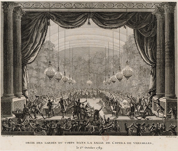 Новая неблагоразумная выходка ускорила взрыв. 1 октября в Версале, в оперном зале королевского дворца, состоялся торжественный банкет в честь офицеров Фландрского пoлкa. Присутствие принцесс и представителей высшей аристократии, музыка, соответствующая настроению собравшихся (исполнялась ария Гретри: «О Ричард, о мой король, все тебя покидают»), вино и появление короля, державшего на руках своего маленького сына, — вызвали со стороны офицеров неистовый взрыв верноподданнических чувств. Они срывали с себя трёхцветные кокарды, топтали их ногами и требовали белых и чёрных кокард (на родине королевы, в Австрии, носили чёрные кокарды). Мария-Антуанетта и придворные дамы вместе с королём делали всё возможное, чтобы довести до белого каления верноподданнические чувства офицеров. Дамы сами прицепляли офицерам и солдатам белые кокарды. Два дня спустя, 3 октября, был устроен второй, подобный же праздник[11].
