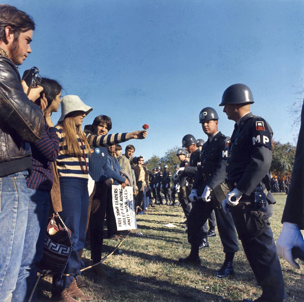 Большую известность получила фотография, сделанная французским фотожурналистом Марком Рибу. На ней запечатлёна семнадцатилетняя Ян Роуз Кашмир (Jan Rose Kasmir) с цветком маргаритки в руке перед строем солдат. Журнал Smithsonian назвал такое «прозрачным соседством вооружённой силы и невинности ребёнка цветов»[6][7]. Другая известная фотография, сделанная 21 октября 1967 года Берни Бостоном из The Washington Star, называется «Сила цветов»; она выдвигалась на Пулитцеровскую премию 1967 года[8]. На фотографии изображён молодой длинноволосый мужчина в водолазке, который вставляет гвоздики в направленные на него винтовки военных полицейских. Кто этот человек, достоверно не известно; на фотографии в газете его имя не указано. Чаще всего высказывается версия, что это Эджерли Харрис III (Edgerly Harris III), восемнадцатилетний актёр из Нью-Йорка, который позднее выступал в Сан-Франциско под сценическим псевдонимом Гибискус[9]. Согласно другой версии, это был Пол Красснер, основатель движения йиппи; согласно третьей — Джоэл Торнабен (Joel Tornabene)[10].