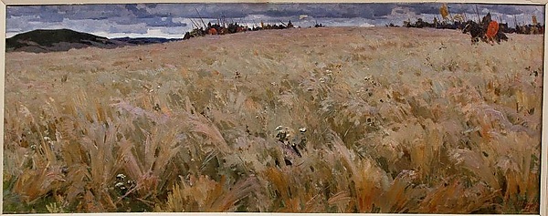 Полотно выполнено в батальном жанре и представляет собой панорамное изображение степи, покрытой ковылём с отдельными кустиками ромашек. На горизонте слева видны тёмные холмы, а в центре и справа — наступающие войска, состоящие из древних воинов на конях, вооружённых копьями и щитами. Позади войска изображено тёмно-синее небо в тучах. Ковыльная степь написана в зеленовато-розовато-сиреневых оттенках, а войско, небо и холмы — в чёрных и тёмно-синих тонах, что подчёркивает драматизм сцены и особенности цветовой гаммы произведения.