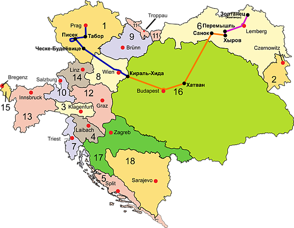 В пути Швейк совершает «будейовицкий анабасис» — пешее путешествие в поисках своего 91-го пехотного полка: Табор — Милевско — Кветов — Враж — Мальчин — Чижова — Седлец — Гораждёвице — Радомышль — Путим — Штекно — Страконице — Дуб — Водняны — Противин — Путим — Писек — Будейовицы[15].