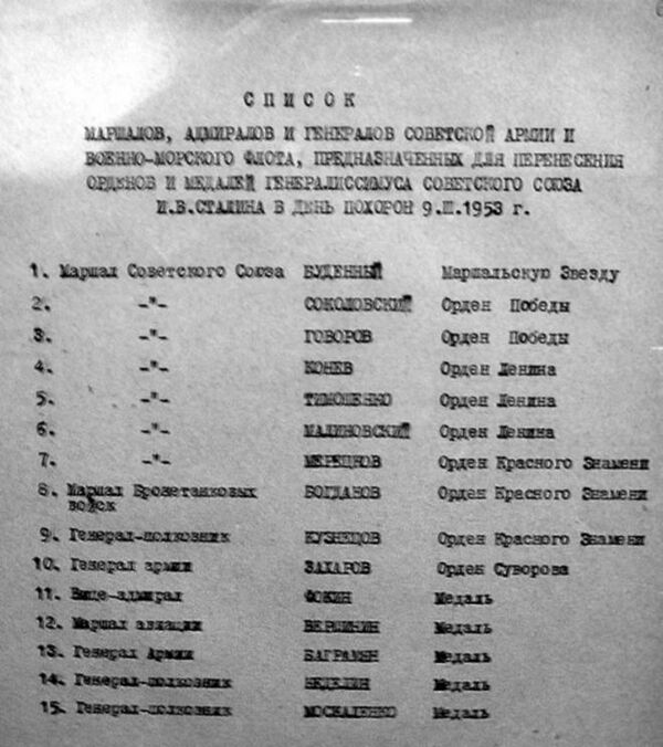 Маршалы и генералы несли на атласных подушках награды Сталина: Маршальскую Звезду (маршал С. М. Будённый), два ордена «Победа» (маршалы В. Д. Соколовский и Л. А. Говоров), три ордена Ленина (маршалы И. С. Конев, С. К. Тимошенко, Р. Я. Малиновский), три ордена Красного Знамени (маршалы К. А. Мерецков, С.И. Богданов и генерал-полковник Кузнецов), орден Суворова I степени (генерал армии Захаров). Медали несли вице-адмирал В.А. Фокин, маршал К.А. Вершинин, генерал армии И.Х. Баграмян, генерал-полковники М.И. Неделин и К. С. Москаленко.