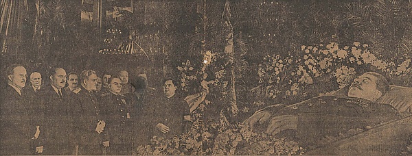 Г. М. Маленков, Л. П. Берия, В. М. Молотов, К. Е. Ворошилов, Н. С. Хрущёв, Н. А. Булганин, Л. М. Каганович и А. И. Микоян встали у гроба, подняли его и медленно внесли в Мавзолей.
