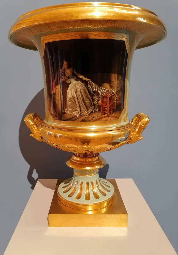 В 1913 году на Императорском фарфоровом заводе в Санкт-Петербурге по проекту А. И. Войткевича была изготовлена ваза-кратер, в оформлении которой был использован «Поцелуй украдкой» (автор росписи Яков Горяев. Крытье надглазурное монохромное, роспись надглазурная полихромная, позолота, цировка, золочение; 55,2 × 42 × 38 см); эта ваза также находится в собрании Эрмитажа (инв. Мз-И-2030)[12].