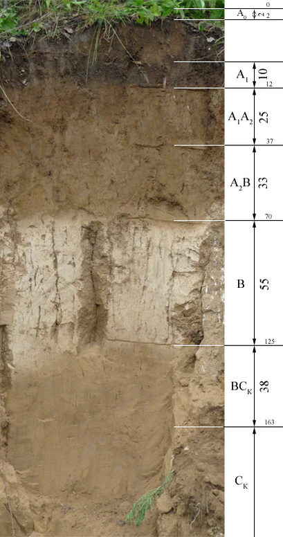 Почвенные горизонты образуются при формировании почв[2]. Они составляют почвенный профиль — вертикальный разрез почвы. На рисунке сверху вниз горизонты обозначены латинскими буквами: