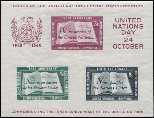 Почтовая администрация ООН выпустила первые марки для нью-йоркского офиса в 1951 году, приурочив их к Международному дню ООН (24 октября 1951 года). Первые выпуски вызвали огромный интерес со стороны коллекционеров, многие ранние коммеморативные марки были проданы миллионными тиражами. Самым редко встречающимся филателистическим материалом этого периода, хотя, всё же, довольно доступным, является почтовый блок к 10-летию ООН (Sc #38), напечатанный тиражом 250 тыс. экземпляров с ошибкой (небольшое белое поле в правой ножке буквы «n» в слове «Unies») и позже исправленный и допечатанный вторым тиражом. В настоящее время рыночная стоимость блока даже второго тиража — $200—240.